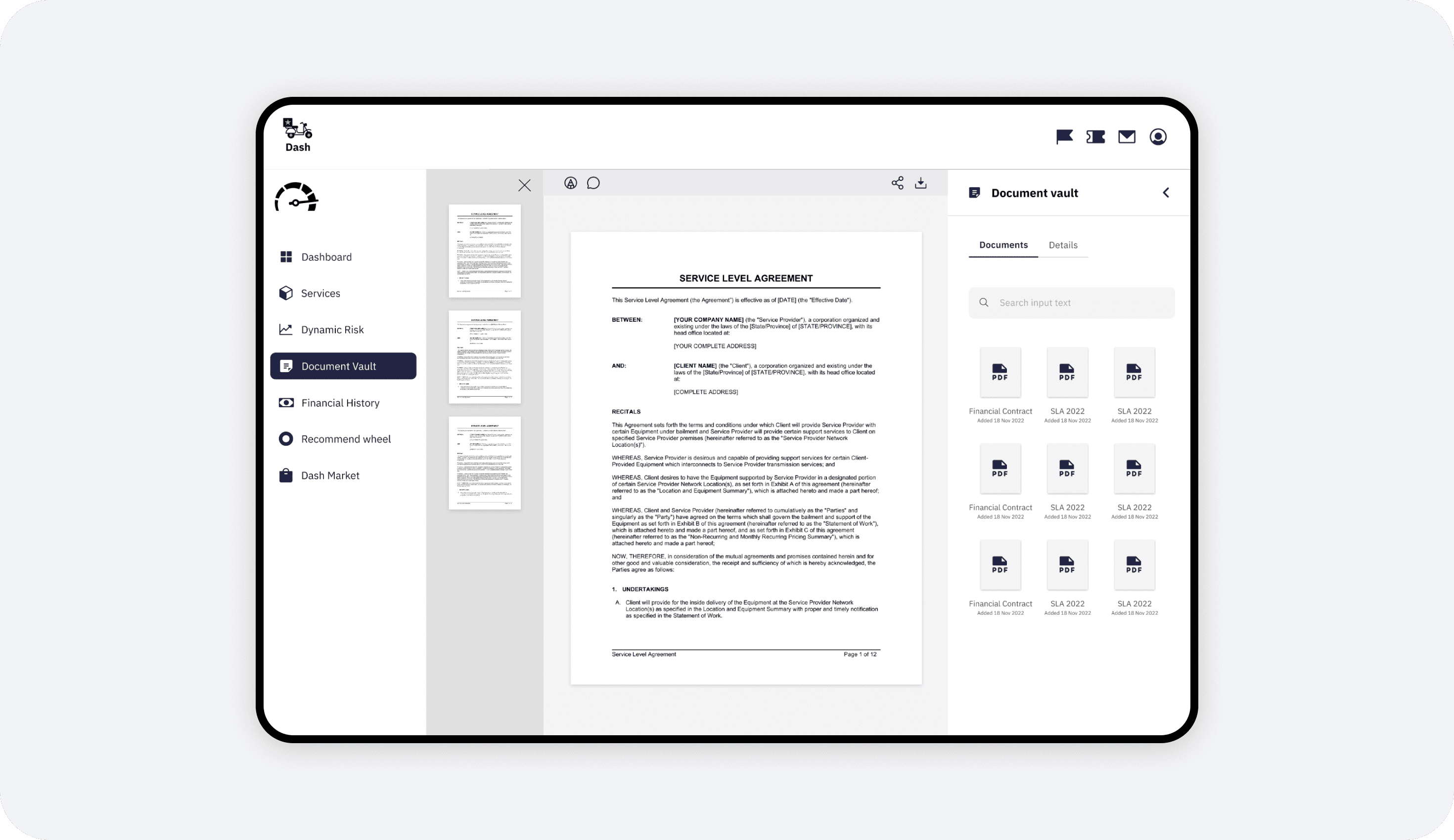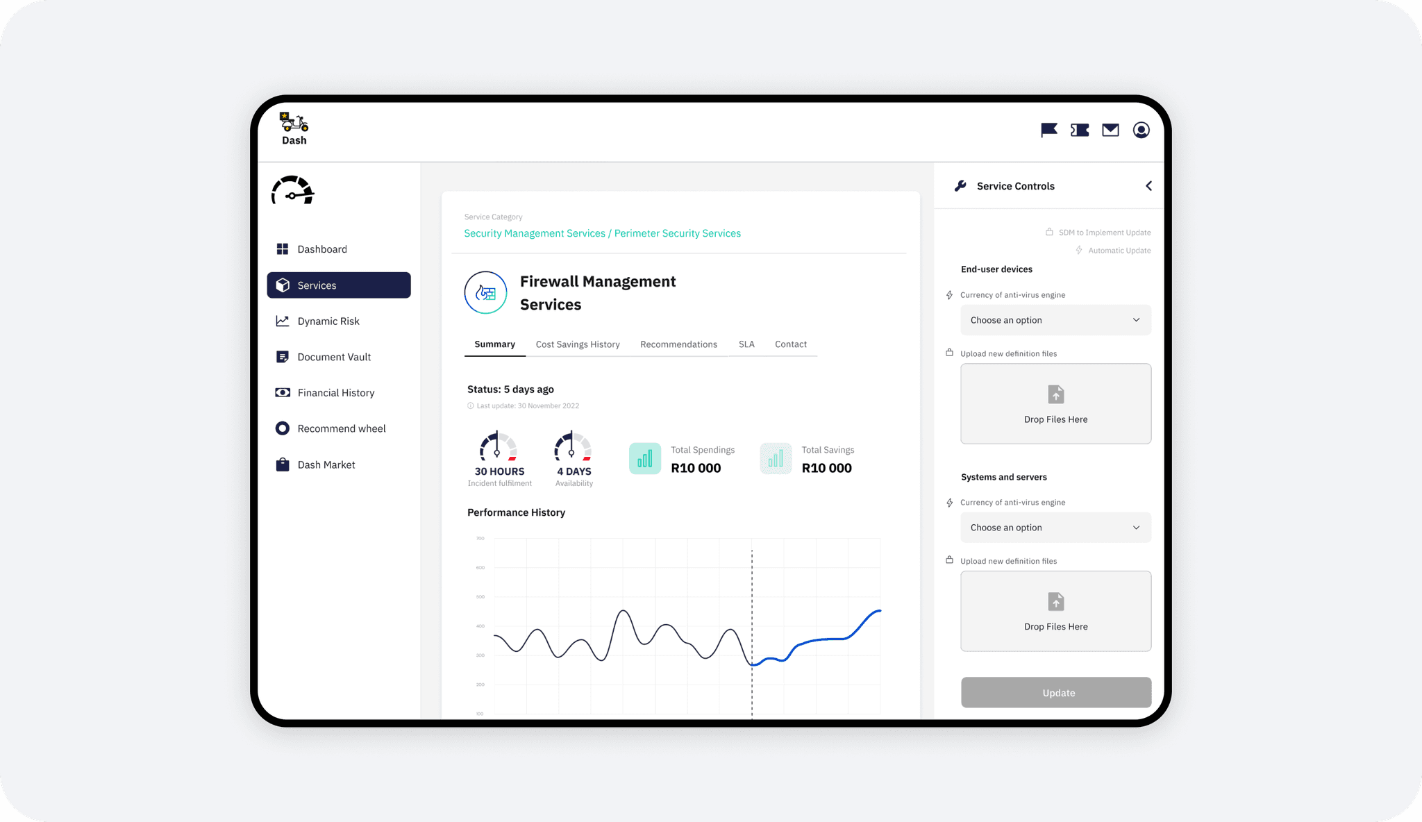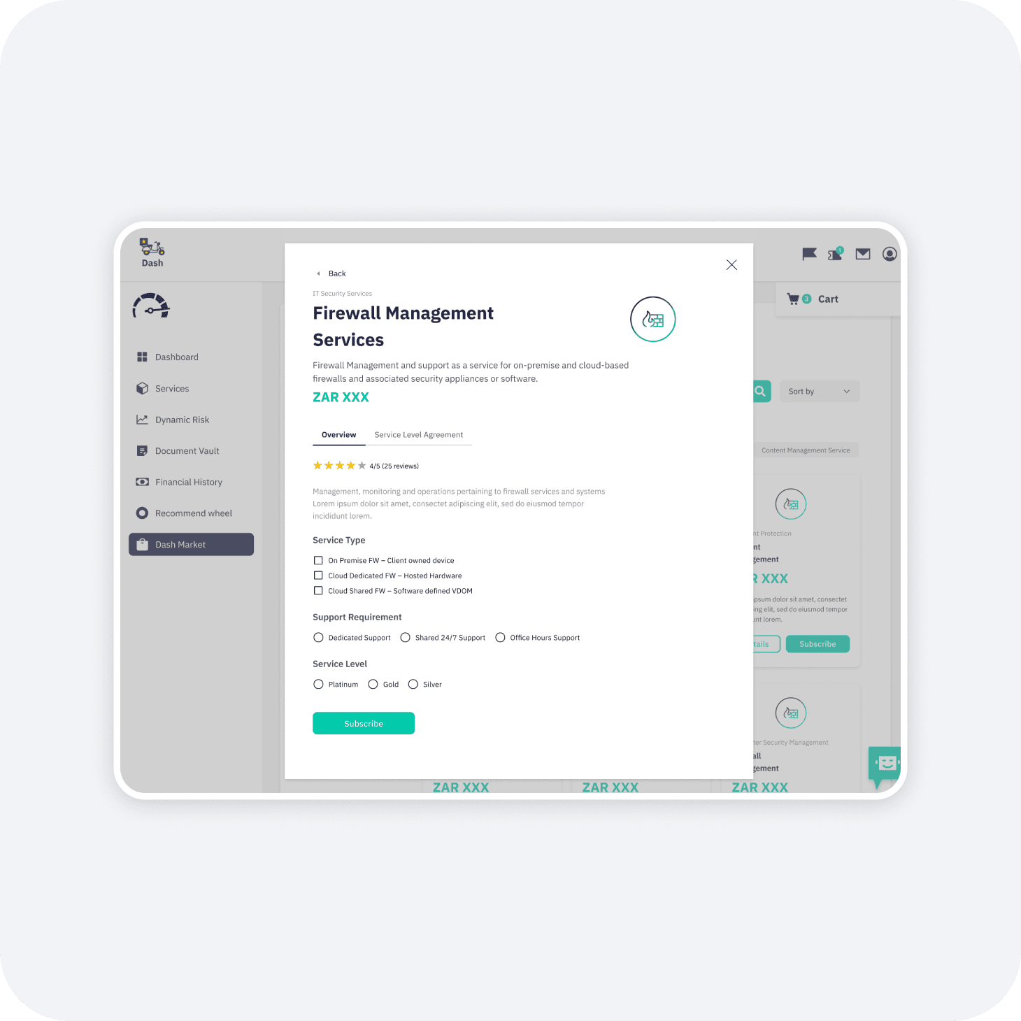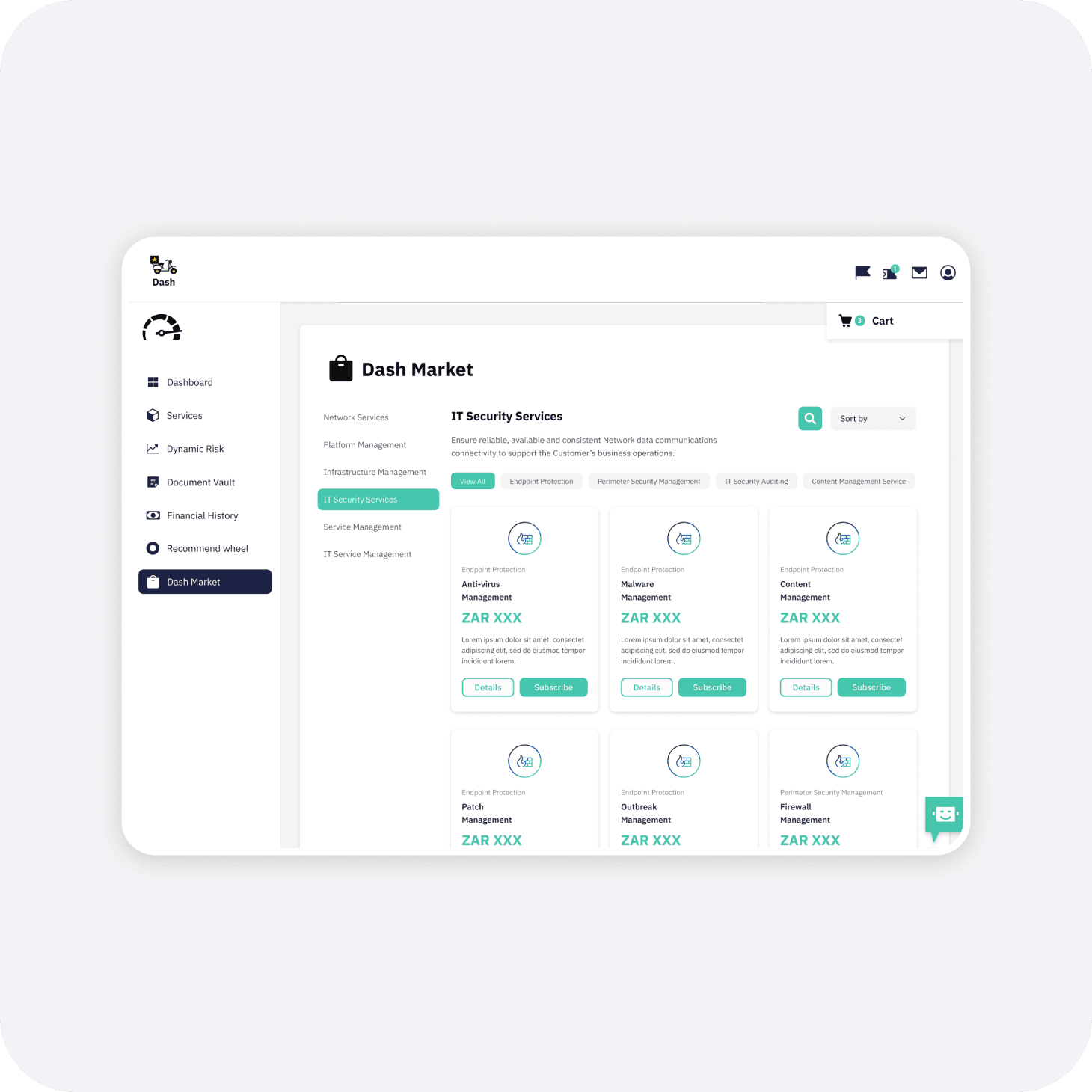 Dash is a dual-purpose platform designed to streamline IT infrastructure management. It functions as both a live monitoring dashboard for existing services, such as Firewall Management and Dynamic Risk assessment, as well as a marketplace for procuring new digital services. I designed the interface to handle complex data visualization while maintaining a clean, e-commerce-like experience. Key features include a "Recommend Wheel" that suggests relevant services based on infrastructure needs, and a "Document Vault" that centralizes Service Level Agreements (SLAs) and financial contracts.